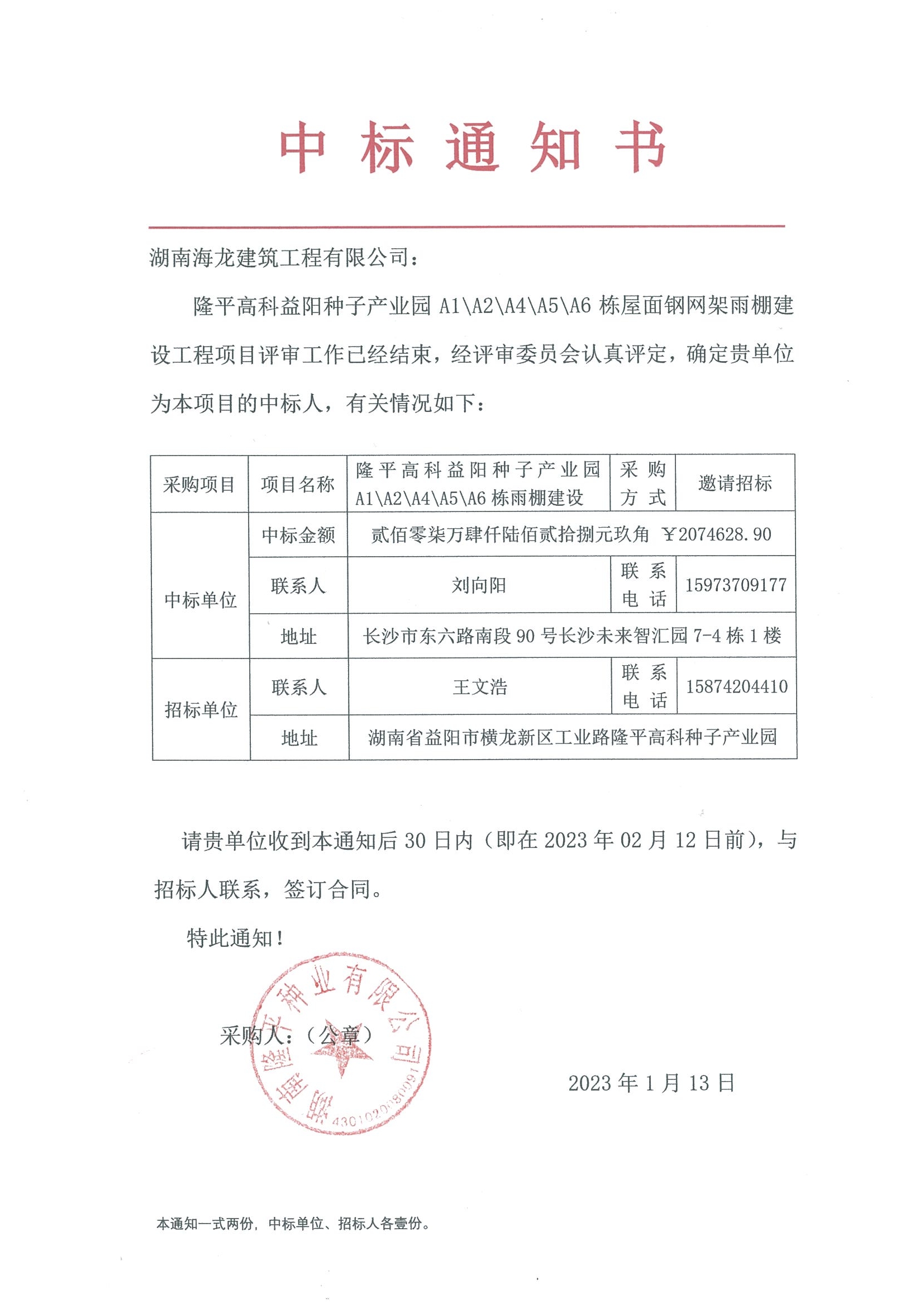 隆平高科益陽種子產(chǎn)業(yè)園A1/A2/A4/A5/A6棟屋面鋼網(wǎng)架雨棚建設(shè)工程招標結(jié)果公示