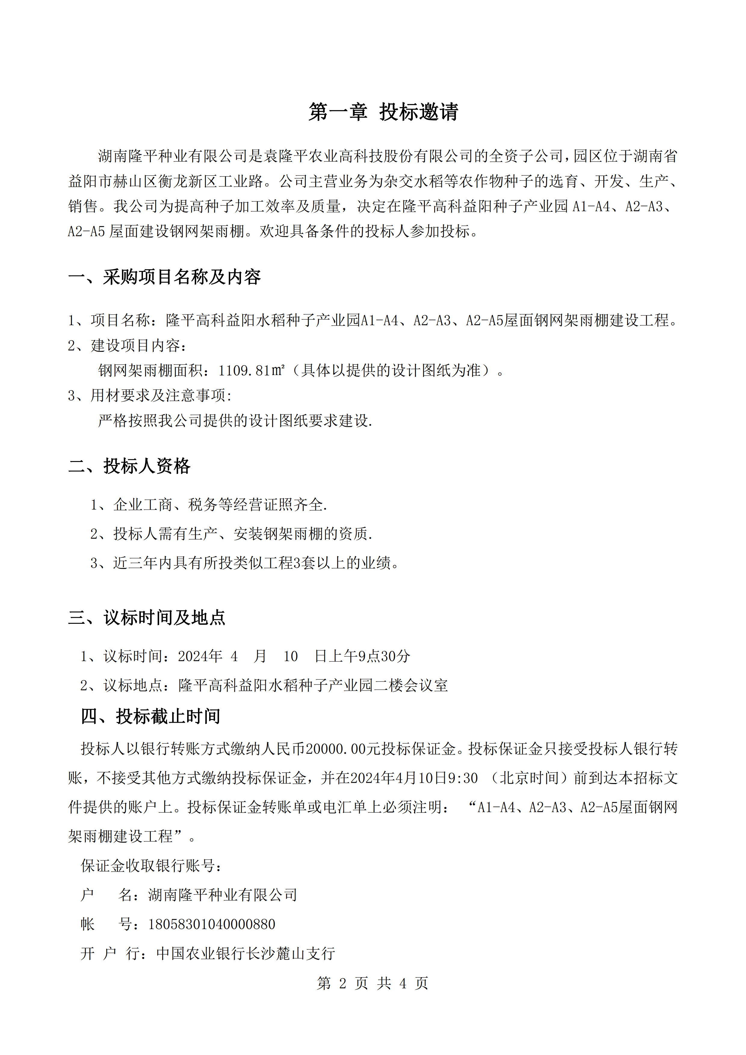 隆平高科益陽(yáng)水稻種子產(chǎn)業(yè)園 A1-A4、A2-A3、A2-A5屋面鋼網(wǎng)架雨棚建設(shè)工程 中標(biāo)通知書