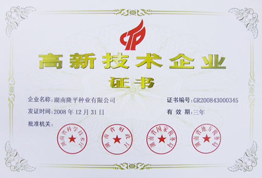 (上圖為獲獎牌匾和證書。) 根據《高新技術企業(yè)認定管理辦法》(國科發(fā)辦[2008]172 號)和《高新技術企業(yè)認定管理工作指引》(國科發(fā)火[2008]362 號)有關規(guī)定,經企業(yè)申報、地方初審、專家審查、公示等程序,我公司于近日收到湖南省科學技術廳、湖南省財政廳、湖南省國家稅務局、湖南省地方稅務局于2009年2 月16日聯合發(fā)布的《關于認定三一重工股份有限公司等318家企業(yè)為湖南省2008年第二批高新技術企業(yè)的通知》(湘科字[2009]20號),認定湖南隆平種業(yè)有限公司為湖南省2008 年第二批高新技術企業(yè),證書編號:GR200843000345;認定有效期3 年。 |
