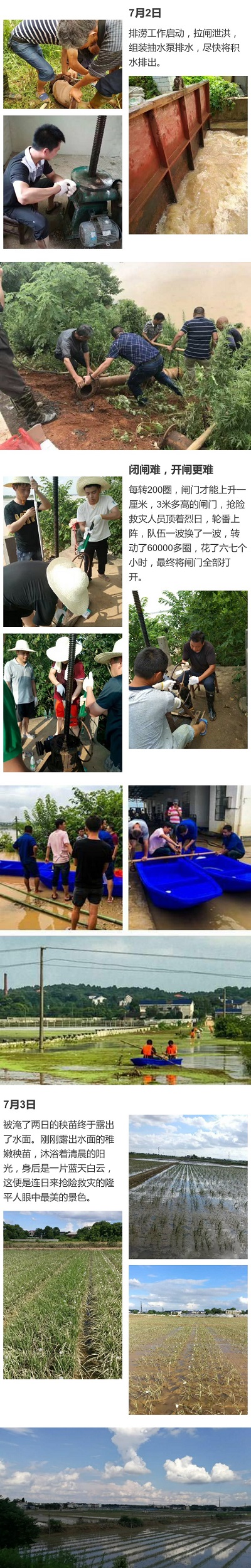 7月1日清早,因河水倒灌,關(guān)山育種基地600余畝試驗田,近50000份核心科研材料被淹,一旦損毀,損失無法估量。事關(guān)公司科研發(fā)展,國家種質(zhì)資源安全,為盡力搶救公司核心科研材料,總經(jīng)理廖翠猛、常務(wù)副總經(jīng)理龍和平火速趕往關(guān)山基地,領(lǐng)導(dǎo)搶險救災(zāi)工作,經(jīng)過摸底排查討論,迅速制定了搶險救災(zāi)計劃。在廖總的領(lǐng)導(dǎo)下,關(guān)山育種基地全體研發(fā)人員打響隆平搶險救災(zāi)保衛(wèi)戰(zhàn)第一槍,緊張有序地開展搶險救災(zāi)工作。 7月1日上午9點,基地緊急租調(diào)大型挖土機(jī)在基地道路上開挖排水通道,加快排除田間積水,以減少科研材料水淹時間。為阻止河水倒灌,大家頂著暴雨,無視腳下滔滔洪水,爬上近5米高的閘口,放下河閘,將滔滔洪水堵在了基地之外。為隨時監(jiān)測汛情,基地研發(fā)人員自發(fā)自愿地加入巡查隊伍,24小時通宵值班,監(jiān)測水位。 7月2日凌晨2點,溈水水面到達(dá)峰值后正緩慢下降。消息傳來,大家連夜行動,開始啟動排澇工作,兵分兩路,迅速行動,一組前往閘口拉閘泄洪,一組前往田間組裝抽水泵排水。與此同時,在公司的組織下,公司領(lǐng)導(dǎo)、行政人事中心、財務(wù)中心多名員工和部分2017屆大學(xué)生積極響應(yīng),高度協(xié)同,支援搶險救災(zāi)工作。 另一方面,7月1日晚上十點,西塘河堤出現(xiàn)潰口,公司100多畝鑒定基地被淹,將近6000份鑒定材料被淹,情況危急。公司基地人員劉文生、王偉峰迅速與總部人員匯合,裝沙袋,堵潰口,加入基地保衛(wèi)戰(zhàn)中。7月3日凌晨1點,經(jīng)過一天兩夜的奮戰(zhàn),險情終于得到控制。7月3日上午,鑒定基地積水已全部排出。 積水退卻,但搶險救災(zāi)工作并未結(jié)束。清理淤泥、清理浮萍、清洗秧苗、噴灑農(nóng)藥等災(zāi)后搶救工作仍在繼續(xù)。在隆平上下一心眾志成城的努力下,這一場來勢兇猛的澇患最終未對科研基地造成實質(zhì)性危害,數(shù)百畝科研材料和鑒定材料得到保存,隆平搶險救災(zāi)保衛(wèi)戰(zhàn)取得了全面勝利。 部分圖片材料來源于隆平高科企業(yè)號。